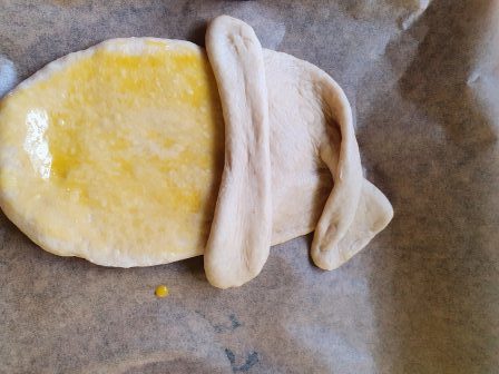 400 g Weizenmehl, Vorteig, 1 gestr. TL Salz, 1 Ei dazugeben und 5 Minuten/Knetstufe zu einem Hefeteig verarbeiten.